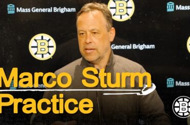 L’entraîneur-chef des Bruins, Marco Sturm, s’entretient avec les médias jeudi après que les Bruins se soient entraînés au Warrior Ice…