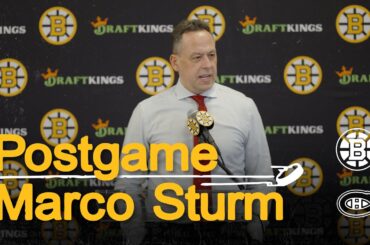 L’entraîneur-chef Marco Sturm s’entretient avec les médias à la suite d’une défaite de 6-2 contre les Canadiens au TD Garden.