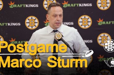 L’entraîneur-chef Marco Sturm parle avec les médias après une défaite de 6-2 contre les Sénateurs au TD Garden.
