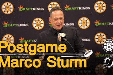 L’entraîneur-chef Marco Sturm parle avec les médias après une victoire de 4-0 contre les Devils au TD Garden.