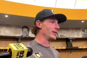 L’attaquant des Penguins Brock McGinn prend la parole après la défaite de 6-2 des Penguins contre les Red Wings de…