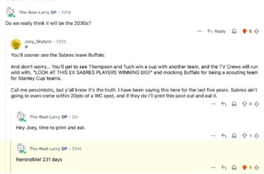 J’ai défini un rappel sur ce post il y a 231 jours. Joey_Sxylynx a déclaré que les Sabres ne s’approcheraient…