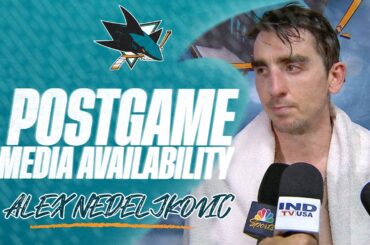 Alex Nedeljkovic s’adresse aux médias après la défaite 3-2 des Sharks contre les Flames de Calgary le 31 janvier 2026.