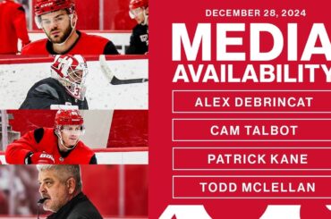 Alex DeBrincat, Patrick Kane, Cam Talbot et Todd McLellan parlent avec les médias après l’entraînement de Détroit au centre d’entraînement…