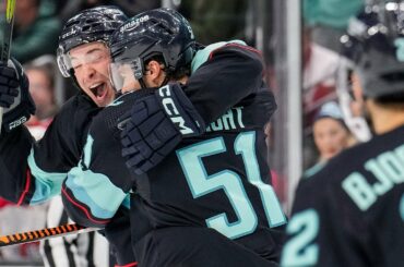 L’attaquant du Kraken Shane Wright enterre le tir devant et inscrit son 1er but dans la LNH, égalant le match…