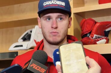L’attaquant des Panthers de la Floride Carter Verhaeghe rencontre les médias après que son équipe a battu les Sénateurs d’Ottawa…