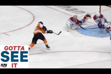 Regardez l’attaquant des Canadiens de Montréal Cole Caufield conserver la possession avec quelques mains douces avant de décocher un tir…