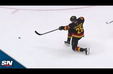 Regardez le défenseur des Canucks de Vancouver Elias Pettersson déchire un seul anéantier de la fente élevée pour son premier…