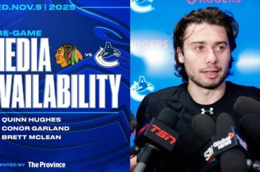 Quinn Hughes, Conor Garland et Brett McLean parlent avec les médias avant le match de mercredi soir contre les Blackhawks…