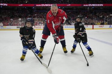 Sergei et Ilya Ovechkin rejoignent leur père Alex Ovechkin sur la glace pour un échauffement d’avant-match avant son match de…