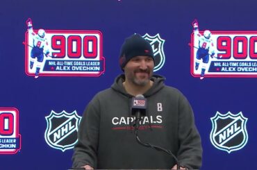 Alex Ovechkin s’adresse aux médias après être devenu le premier joueur de la LNH à marquer 900 buts en carrière.