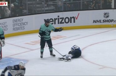 Carson Soucy contre Jack McBain du Seattle Kraken au match des Coyotes de l’Arizona le 10 avril 2023. via https://www.hockeyfights.com