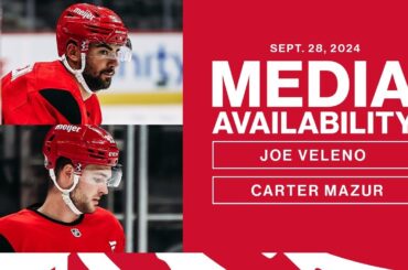 Joe Veleno et Carter Mazur parlent avec les médias après l’entraînement matinal des Red Wings de Détroit le samedi 28…