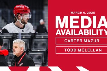 Carter Mazur et Todd McLellan parlent avec les médias après le patin matinal de Détroit à la petite Arena Caesars…