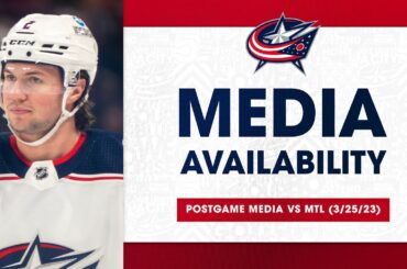 L’entraîneur-chef Brad Larsen, Boone Jenner, Lane Pederson et Kirill Marchenko s’adressent aux médias après le match de ce soir contre…