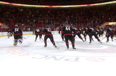 In @Hurricanes de la Caroline Justin Williams mène la célébration de l’équipe des Hurricanes octobre 8, 2018 Le capitaine Justin Williams mène la célébration d’après-match des Hurricanes en alignant l’équipe sur la ligne bleue avant de patiner…