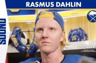 Le capitaine des Sabres de Buffalo, Rasmus Dahlin, s’adresse aux médias après l’entraînement et discute des deux premiers matchs de…