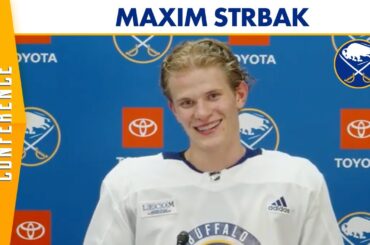 Maxim Strbak, espoir des Sabres de Buffalo, s’adresse aux médias après la première journée du camp de développement. Strbak parle…