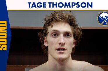 L’attaquant des Sabres de Buffalo, Tage Thompson, s’adresse aux médias après une défaite de 4-1 contre les Red Wings de…