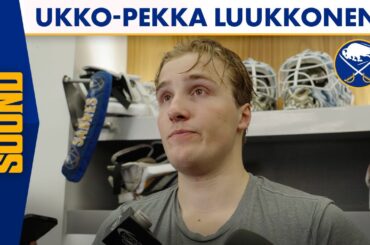 Le gardien des Sabres de Buffalo, Ukko Pekka Luukkonen, s’adresse aux médias après une victoire en fusillade de 3-2 contre…