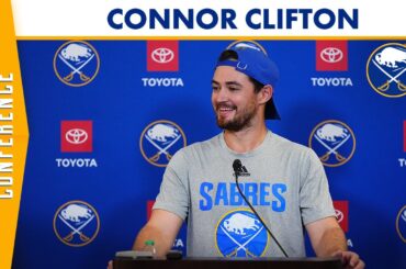 Le défenseur des Sabres Connor Clifton s’adresse aux médias après son premier entraînement avec l’équipe après avoir signé comme agent…