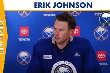 Le défenseur des Sabres Erik Johnson s’adresse aux médias après la deuxième journée du camp d’entraînement. Il discute de ses…