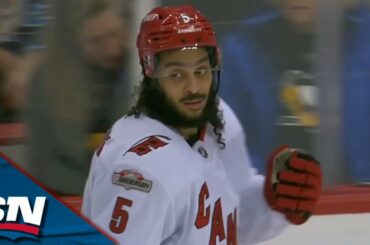 Regardez le défenseur des Hurricanes de la Caroline Jalen Chatfield patiner vers le bas d’une rondelle libre lors d’un avantage…