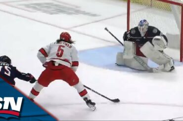 Le défenseur des Hurricanes Jalen Chatfield allume les jets pour marquer un shorty du revers sur les Blue Jackets de…