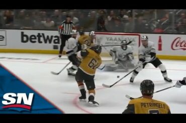 Regardez alors que l’attaquant de Las Vegas Mark Stone survole le gardien de but des Kings de Los Angeles Jonathan…