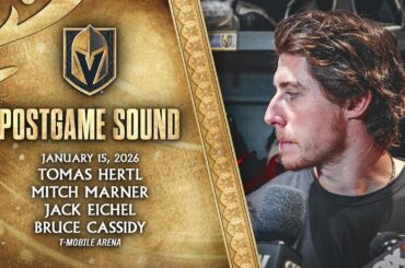 Tomas Hertl, Mitch Marner, Jack Eichel et l’entraîneur-chef Bruce Cassidy s’adressent aux médias après le match de jeudi contre les…