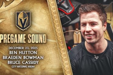 Ben Hutton, Braeden Bowman et l’entraîneur-chef Bruce Cassidy parlent aux médias après un entraînement matinal d’avant-match au City National Arena,…