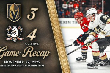 Les Golden Knights de Vegas sont tombés face aux Ducks d’Anaheim, 4-3 en prolongation, le 22 novembre 2025, au Honda…