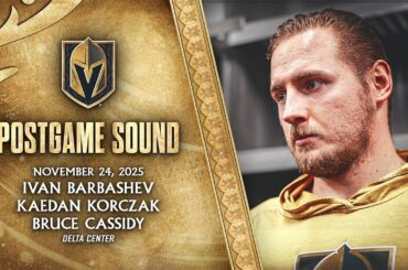 Ivan Barbashev, Kaedan Korczak et l’entraîneur-chef Bruce Cassidy s’adressent aux médias après le match de lundi contre les Mammoth de…