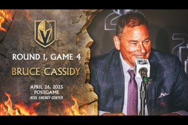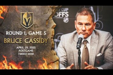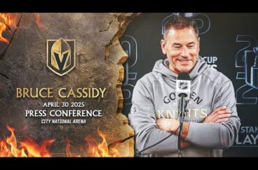 L’entraîneur-chef Bruce Cassidy parle aux médias après une victoire de 4-3 en prolongation dans le match 4 de la série…