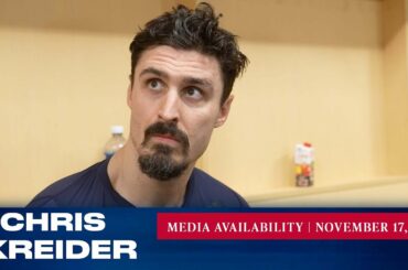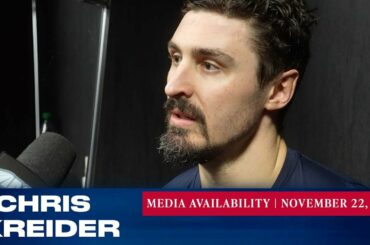L’attaquant des Rangers de New York Chris Kreider répond aux questions des médias après le match du 22 novembre contre…