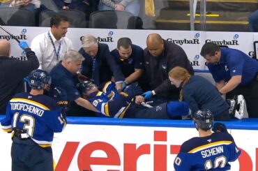 In @Blues de Saint-Louis Dylan Holloway s’est étiré hors de la glace après avoir touché la rondelle au cou novembre 6, 2024 Saison 2024 – 2025 Lightning de Tampa Bay contre Blues de St. Louis 11/5/2024