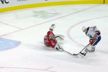 Le gardien des Hurricanes Pyotr Kochetkov effectue un arrêt agressif pour empêcher Zach Hyman de faire une échappée, gardant la…