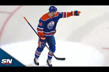 Regardez Mattias Ekholm des Oilers d’Edmonton déboucher un méchant tir frappé en haut de l’étagère devant le gardien des Golden…