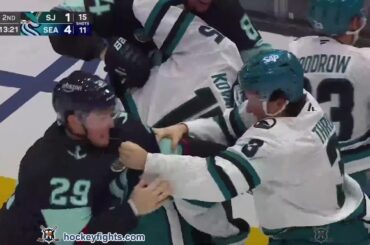 Henry Thrun contre Vince Dunn des Sharks de San Jose au match du Seattle Kraken le 30 janvier 2025. via…