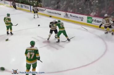 Mark Kastelic contre Marcus Foligno des Bruins de Boston au Minnesota Wild Game le 2 mars 2025. Via https://www.hockeyfights.com