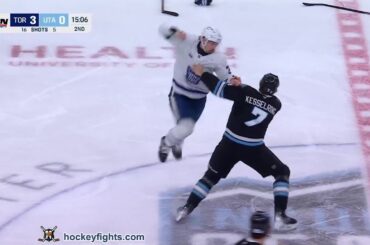 Simon Benoit vs Michael Kesselring des Maple Leafs de Toronto au Utah Hockey Club Game le 10 mars 2025. Via…