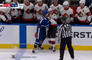 Adam Gaudette contre Nikita Grebenkin des Sénateurs d’Ottawa lors du match des Maple Leafs de Toronto le 22 septembre 2024.…