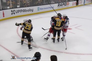 Brennan Othmann contre Parker Wotherspoon des Rangers de New York lors du match des Bruins de Boston le 22 septembre…