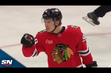 Regardez Connor Bedard des Blackhawks de Chicago trouver le fond du filet sur un tir sur réception maladroit sur un…