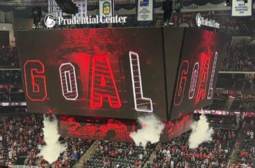 Corne de but des Devils du New Jersey utilisée pendant la saison 2025-26 de la LNH au Prudential Center de…