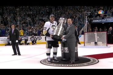 In @Penguins de Pittsburgh Les Penguins soulèvent la Coupe Stanley | The Penguins raise Stanley Cup juin 17, 2016 Le commissaire Gary Bettman décerne la Coupe Stanley au capitaine Sidney Crosby et les Penguins de Pittsburgh. _ Commissioner Gary…