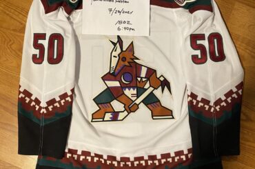 Je vends mes Coyotes taille 46 à Kachina. Le joueur est Durzi. Le nom est brodé comme sur les maillots…