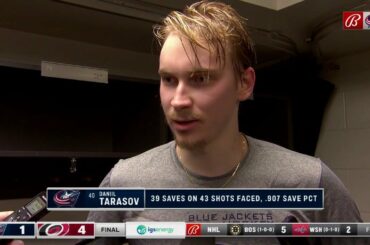 Après avoir sauvé 39 des 43 tirs affrontés lors de la défaite des Blue Jackets en Caroline, Tarasov parle de…