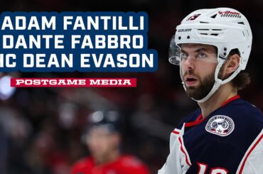 Adam Fantilli, Dante Fabbro et l’entraîneur-chef Dean Evason s’adressent aux médias après le match en Caroline. Suivez le #CBJ sur…