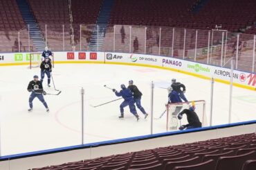 Nous avons assisté à un exercice de combat à 3 contre 3 sur petite glace lors de l’entraînement des Canucks…